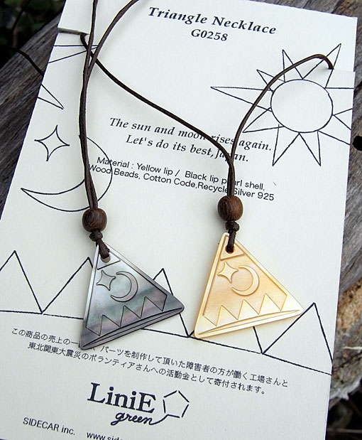 奄美大島で養殖された希少な黒蝶貝と白蝶貝を使い、長崎市社会福祉法人のパール加工工場で働く障害者の方に制作をお願いした、 震災へのチャリティーアイテム。